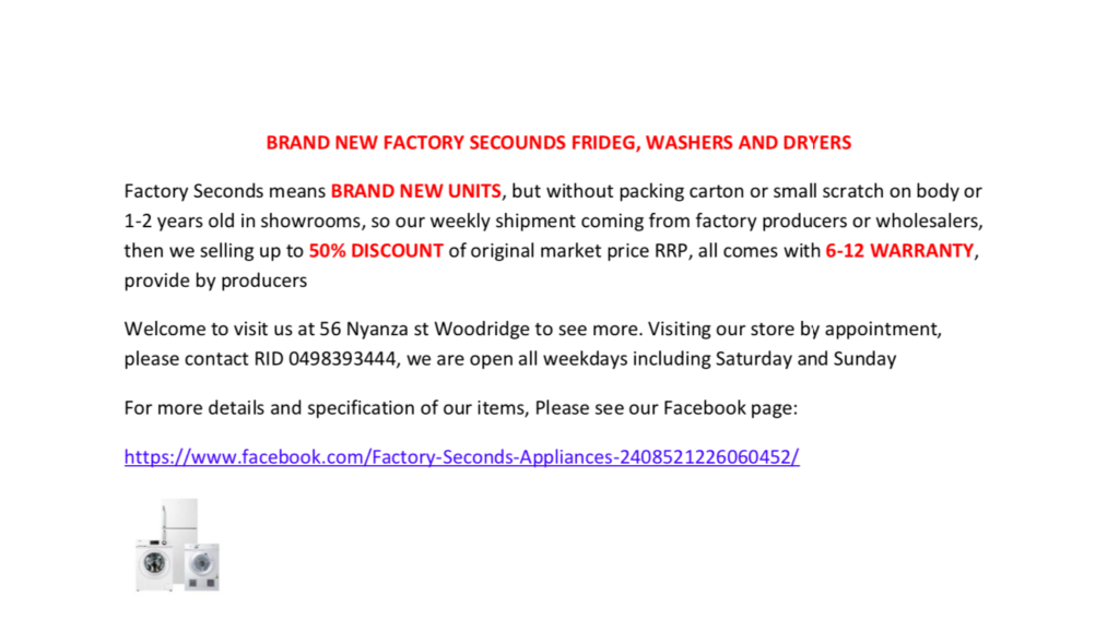 BRAND NEW FACTORY SECOUNDS FRIDEG, WASHERS AND DRYERS